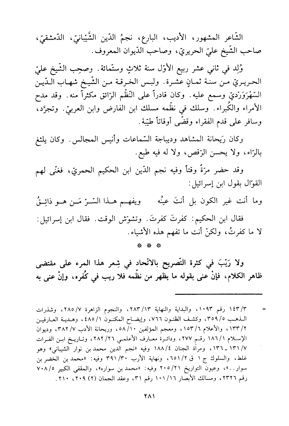 ولا رَيْبَ فِي كثرة التّصريح بالاتّحاد فِي شِعر هَذَا المرء على مقتضى ظاهر الكلام، فإنْ عنى بقوله ما يظهر من نظْمه فلا ريب في كفره، وإن عنى به