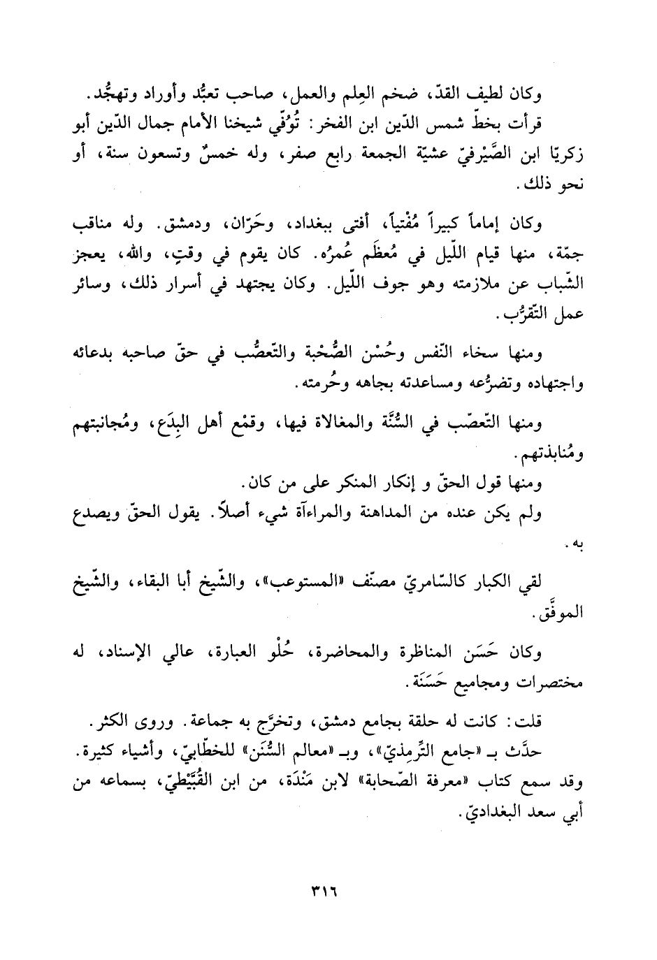 وكان إماما كبيرا مُفْتيًا، أفتى ببغداد، وحَرّان، ودمشق. وله مناقب جمّة، منها قيام اللّيل فِي مُعظَم عمره. كان يقوم فِي وقتٍ، والله، يعجز الشّباب عن ملازمته وهو جوف اللّيل. وكان يجتهد فِي أسرار ذلك، وسائر عمل التّقرُّب.