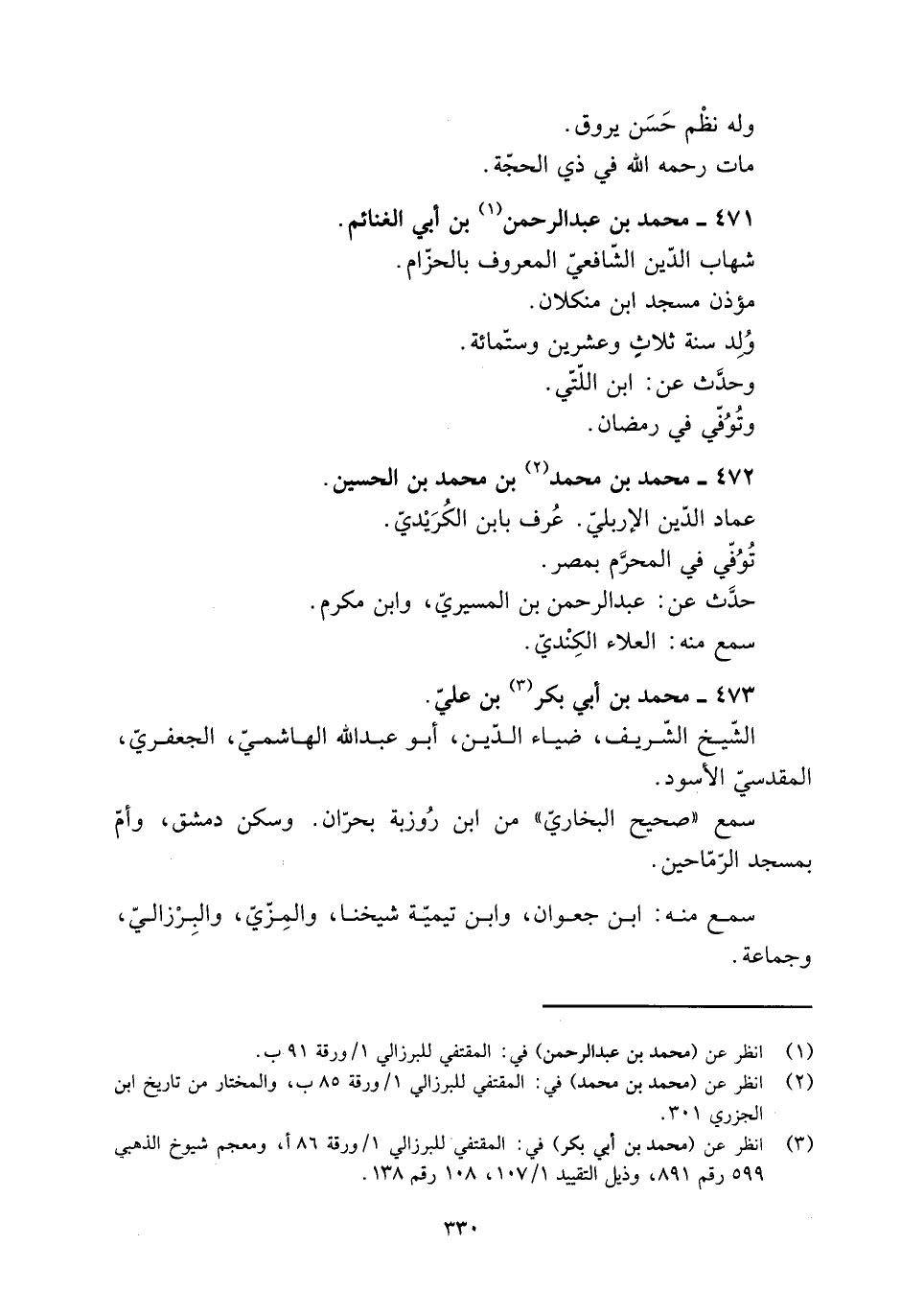 [2] انظر عن (محمد بن محمد) في: المقتفي للبرزالي 1/ ورقة 85 ب، والمختار من تاريخ ابن الجزري 301.