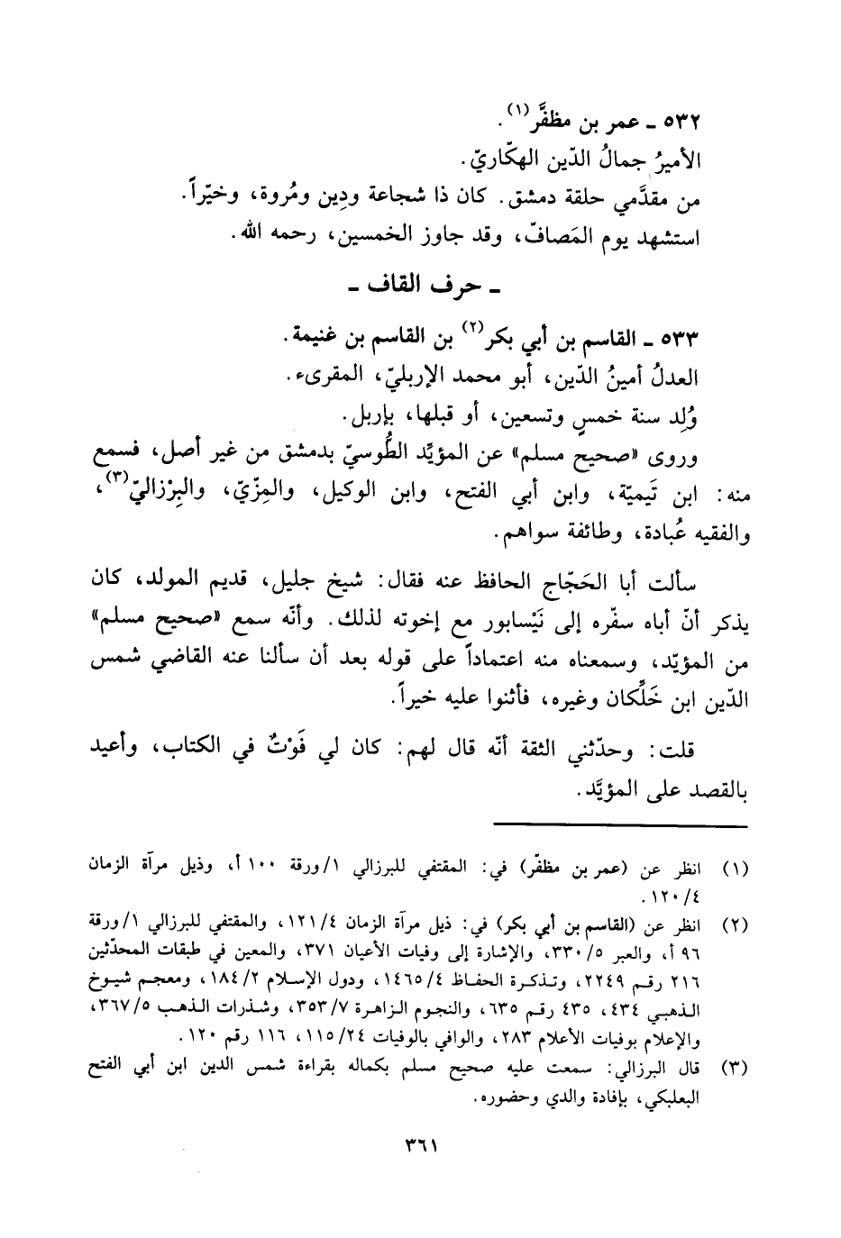 [1] انظر عن (عمر بن مظفّر) في: المقتفي للبرزالي 1/ ورقة 100 أ، وذيل مرآة الزمان 4/ 120.