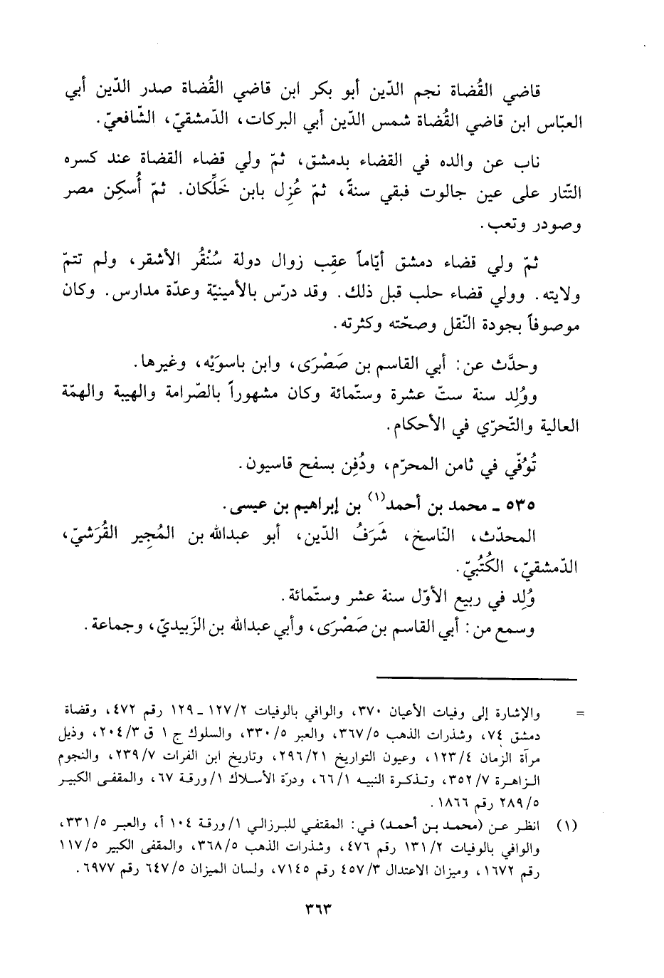 [1] انظر عن (محمد بن أحمد) في: المقتفي للبرزالي 1/ ورقة 104 أ، والعبر 5/ 331، والوافي بالوفيات 2/ 131 رقم 476، وشذرات الذهب 5/ 368، والمقفى الكبير 5/ 117 رقم 1672، وميزان الاعتدال 3/ 457 رقم 7145، ولسان الميزان 5/ 647 رقم 6977.