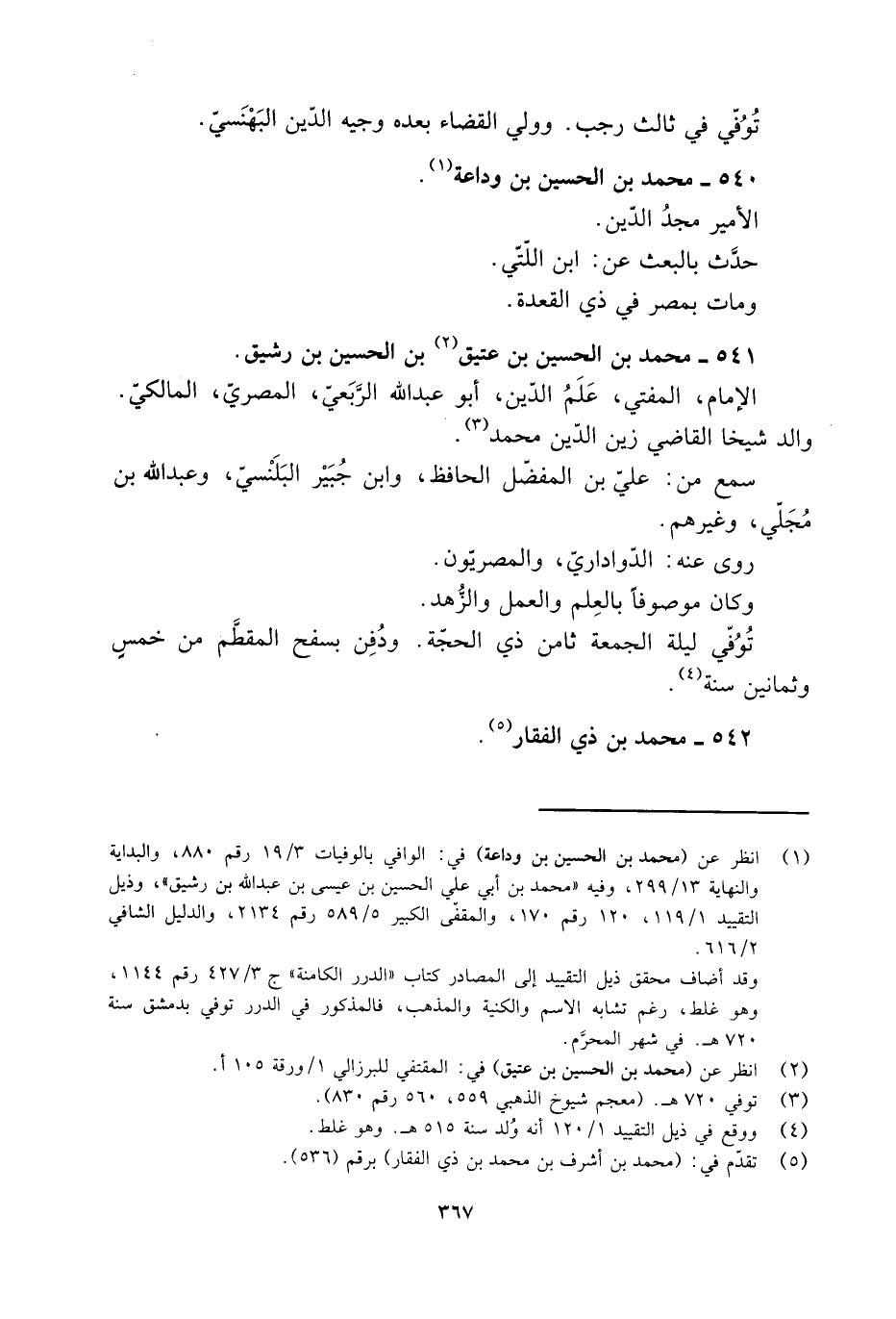 [1] انظر عن (محمد بن الحسين بن وداعة) في: الوافي بالوفيات 3/ 19 رقم 880، والبداية والنهاية 13/ 299، وفيه «محمد بن أبي علي الحسين بن عيسى بن عبد الله بن رشيق» ، وذيل التقييد 1/ 119، 120 رقم 170، والمقفّى الكبير 5/ 589 رقم 2134، والدليل الشافي 2/ 616.