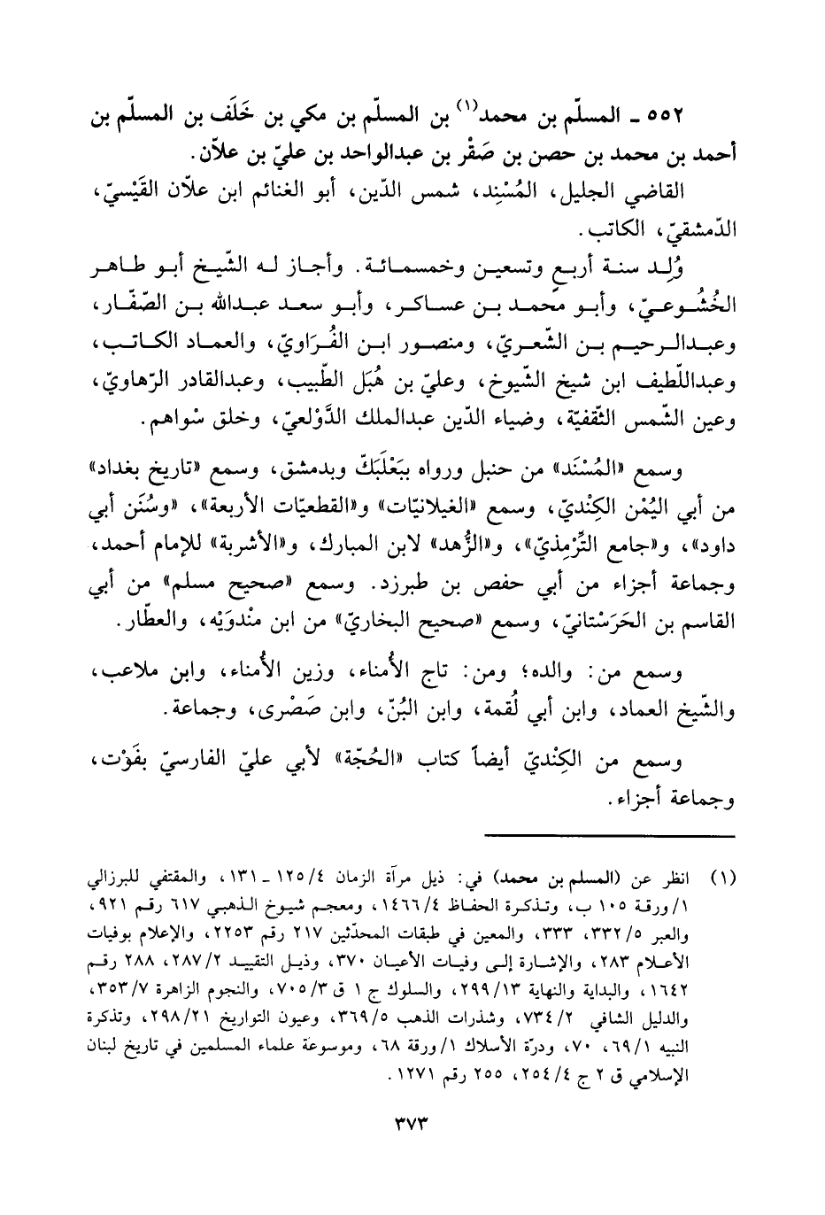 [1] انظر عن (المسلم بن محمد) في: ذيل مرآة الزمان 4/ 125- 131، والمقتفي للبرزالي 1/ ورقة 105 ب، وتذكرة الحفاظ 4/ 1466، ومعجم شيوخ الذهبي 617 رقم 921، والعبر 5/ 332، 333، والمعين في طبقات المحدّثين 217 رقم 2253، والإعلام بوفيات الأعلام 283، والإشارة إلى وفيات الأعيان 370، وذيل التقييد 2/ 287، 288 رقم 1642، والبداية والنهاية 13/ 299، والسلوك ج 1 ق 3/ 705، والنجوم الزاهرة 7/ 353، والدليل الشافي 2/ 734، وشذرات الذهب 5/ 369، وعيون التواريخ 21/ 298، وتذكرة النبيه 1/ 69، 70، ودرّة الأسلاك 1/ ورقة 68، وموسوعة علماء المسلمين في تاريخ لبنان الإسلامي ق 2 ج 4/ 254، 255 رقم 1271.