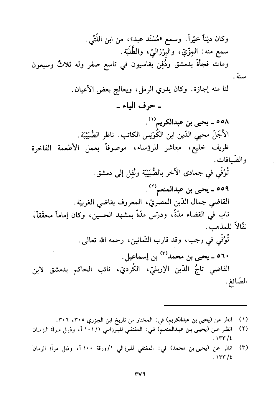 [3] انظر عن (يحيى بن محمد) في: المقتفي للبرزالي 1/ ورقة 100 أ، وذيل مرآة الزمان 4/ 133.