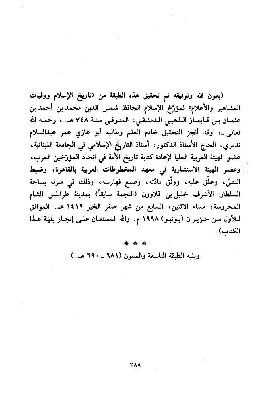 (بعون الله وتوفيقه تم تحقيق هذه الطبقة من «تاريخ الإسلام ووفيات المشاهير والأعلام» لمؤرّخ الإسلام الحافظ شمسُ الدين مُحَمَّدُ بْنُ أَحْمَد بْن عثمان بن قايماز الذهبي الدمشقيّ، المتوفى سنة 748 هـ.، رحمه الله تعالى-، وقد أنجز التحقيق خادم العلم وطالبه أبو غازي عمر عبد السلام تدمري، الحاج الأستاذ الدكتور، أستاذ التاريخ الإسلامي في الجامعة اللبنانية، عضو الهيئة العربية العليا لإعادة كتابة تاريخ الأمة في اتحاد المؤرّخين العرب، وعضو الهيئة الاستشارية في معهد المخطوطات العربية بالقاهرة، وضبط النصّ، وعلّق عليه، ووثّق مادّته، وصنع فهارسه، وذلك في منزله بساحة السلطان الأشرف خليل بن قلاوون (النجمة سابقا) بمدينة طرابلس الشام المحروسة، مساء الاثنين، السابع من شهر صفر الخير 1419 هـ. الموافق للأول من حزيران (يونيو) 1998 م. والله المستعان على إنجاز بقيّة هذا الكتاب) .