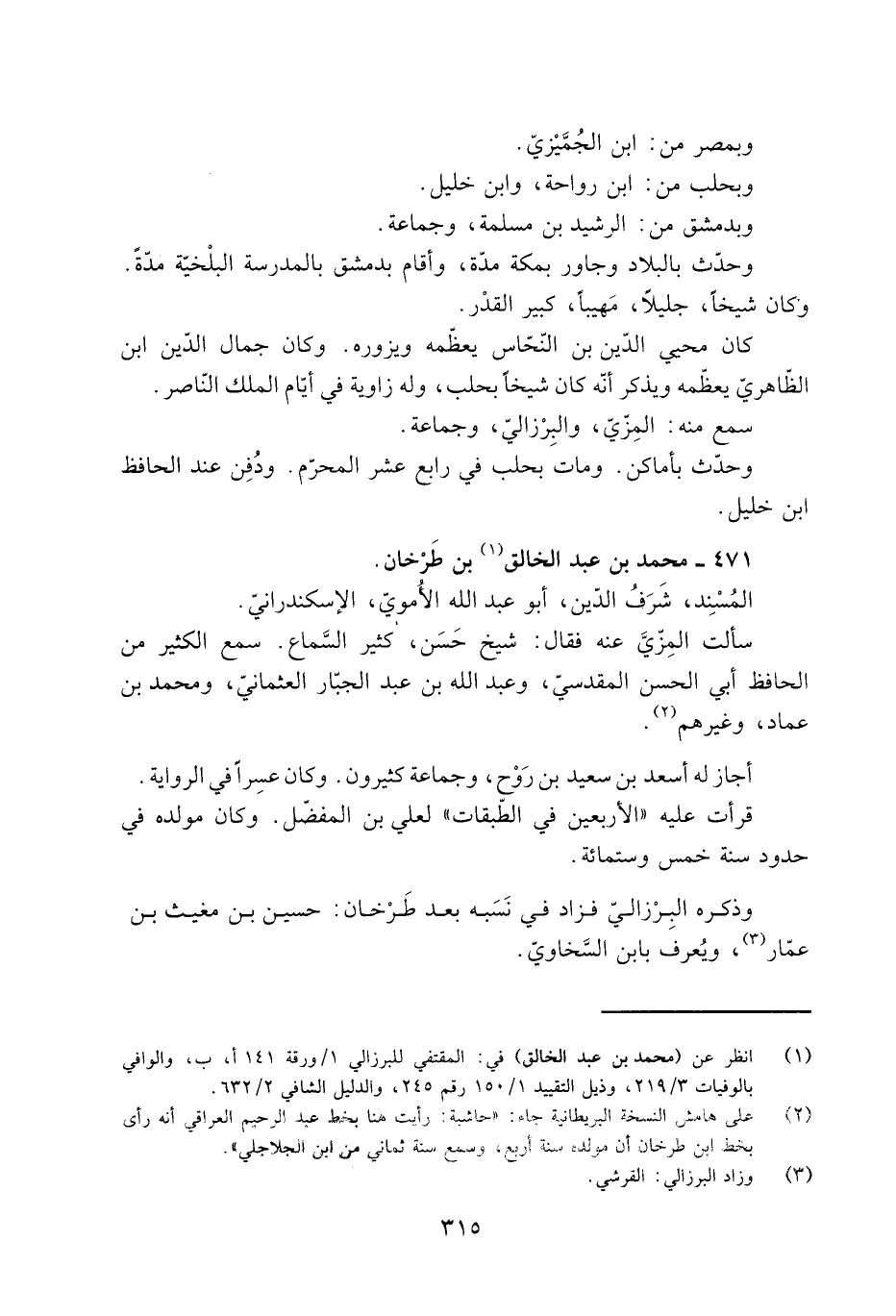 [2] على هامش النسخة البريطانية جاء: «حاشية: رأيت هنا بخط عبد الرحيم العراقي أنه رأى بخط ابن طرخان أن مولده سنة أربع، وسمع سنة ثماني من ابن الجلاجليّ» .