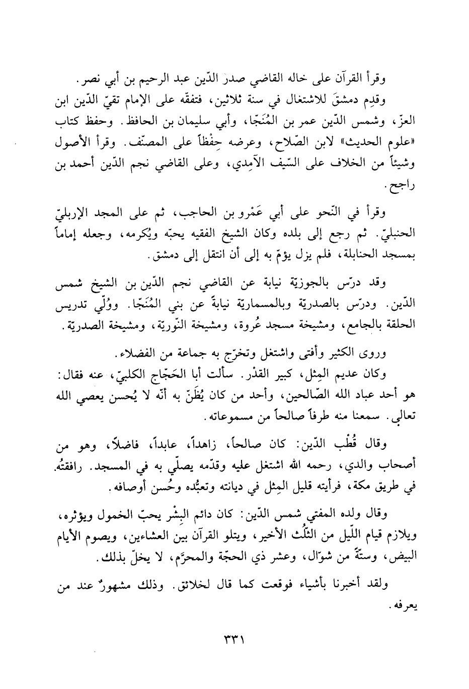 وقرأ فِي النّحو عَلَى أَبِي عَمْرو بْن الحاجب، ثم عَلَى المجد الإربليّ الحنبليّ. ثم رجع إلى بلده وكان الشّيْخ الفقيه يحبّه ويُكرمه، وجعله إماما بمسجد الحنابلة، فلم يزل يؤمّ بِهِ إلى أن انتقل إلى دمشق.