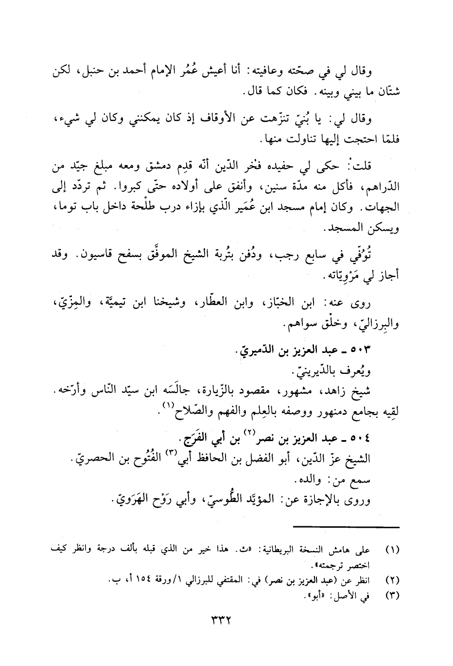 [2] انظر عن (عبد العزيز بن نصر) في: المقتفي للبرزالي 1/ ورقة 154 أ، ب.