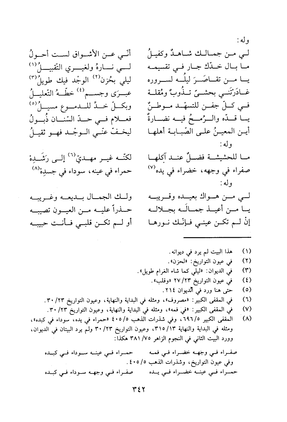 [8] المقفى الكبير 5/ 696، وفي شذرات الذهب 5/ 405 «حمراء في يده، سوداء في كبده» ، ومثله في البداية والنهاية 13/ 315، وعيون التواريخ 23/ 30 ولم يرد البيتان في الديوان، وورد البيت الثاني في النجوم الزاهرة 75/ 381 هكذا: