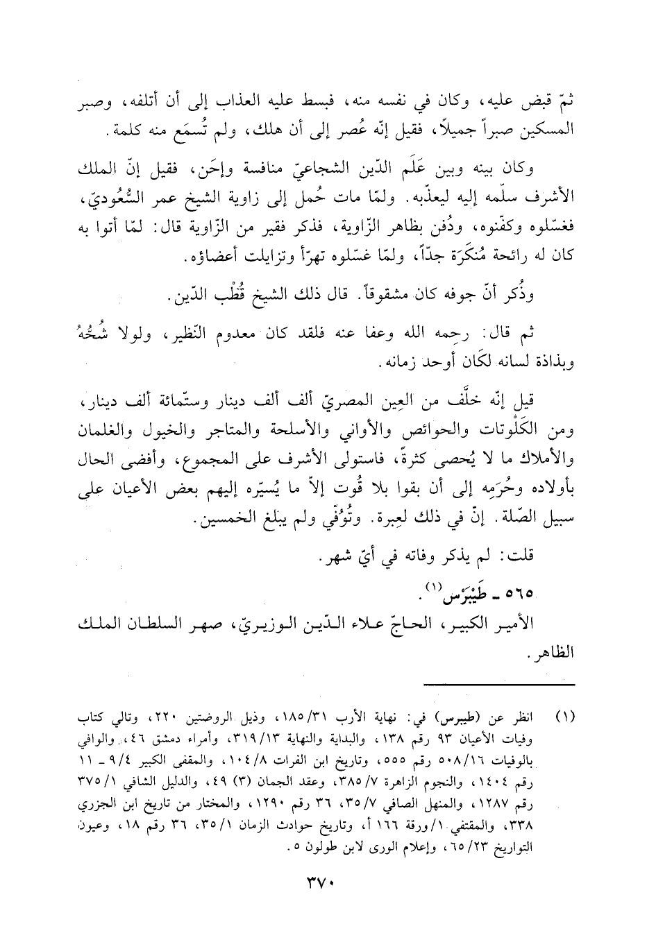 [1] انظر عن (طيبرس) في: نهاية الأرب 31/ 185، وذيل الروضتين 220، وتالي كتاب وفيات الأعيان 93 رقم 138، والبداية والنهاية 13/ 319، وأمراء دمشق 46، والوافي بالوفيات 16/ 508 رقم 555، وتاريخ ابن الفرات 8/ 104، والمقفى الكبير 4/ 9- 11 رقم 1404، والنجوم الزاهرة 7/ 385، وعقد الجمان (3) 49، والدليل الشافي 1/ 375 رقم 1287، والمنهل الصافي 7/ 35، 36 رقم 1290، والمختار من تاريخ ابن الجزري 338، والمقتفي 1/ ورقة 166 أ، وتاريخ حوادث الزمان 1/ 35، 36 رقم 18، وعيون التواريخ 23/ 65، وإعلام الورى لابن طولون 5.