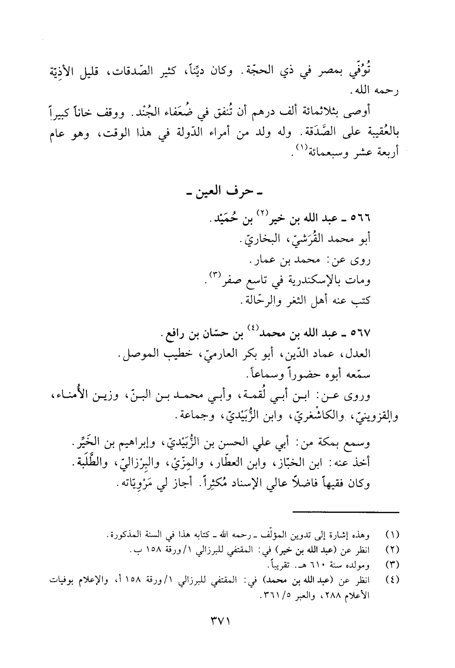 [4] انظر عن (عبد الله بن محمد) في: المقتفي للبرزالي 1/ ورقة 158 أ، والإعلام بوفيات الأعلام 288، والعبر 5/ 361.