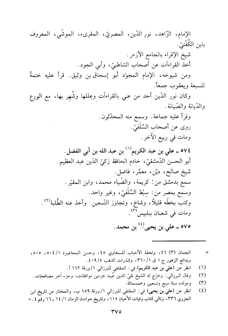 [4] انظر عن (علي بن يحيى) في: المقتفي للبرزالي 1/ ورقة 159 ب، والمختار من تاريخ ابن الجزري 336، وتالي كتاب وفيات الأعيان 115، وتاريخ حوادث الزمان 1/ 14- 16 رقم 4.-