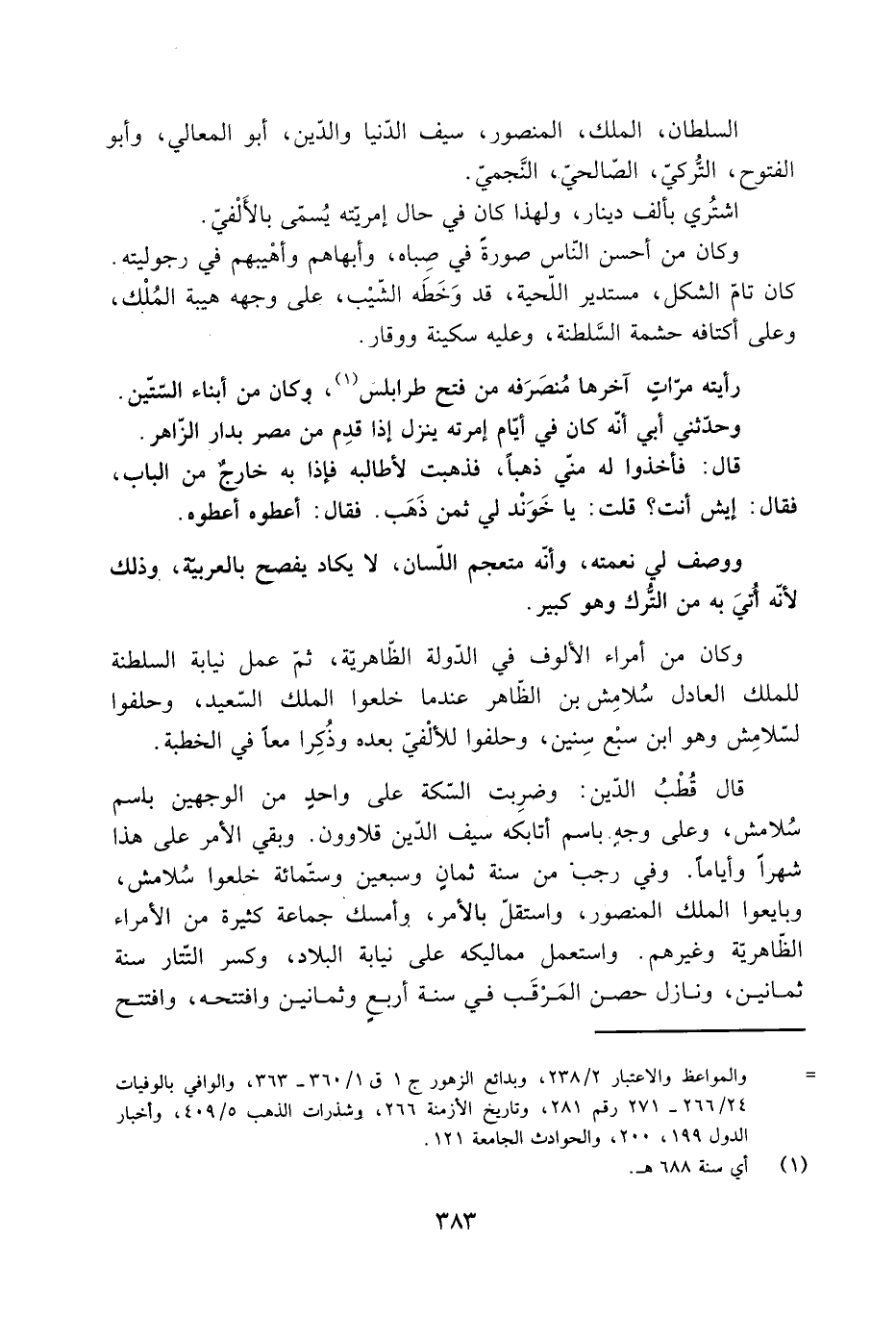 قَالَ قُطْبُ الدّين: وضربت السّكة عَلَى واحد من الوجهين باسم سُلامش، وعلى وجه باسم أتابكه سيف الدّين قلاوون. وبقي الأمر عَلَى هذا شهرا وأياما. وفي رجب من سنة ثمانٍ وسبعين وستّمائة خلعوا سُلامش، وبايعوا الملك المنصور، واستقلّ بالأمر، وأمسك جماعة كثيرة من الأمراء الظّاهريّة وغيرهم. واستعمل مماليكه عَلَى نيابة البلاد، وكسر التّتار سنة ثمانين، ونازل حصن المَرْقب فِي سنة أربعٍ وثمانين وافتتحه، وافتتح