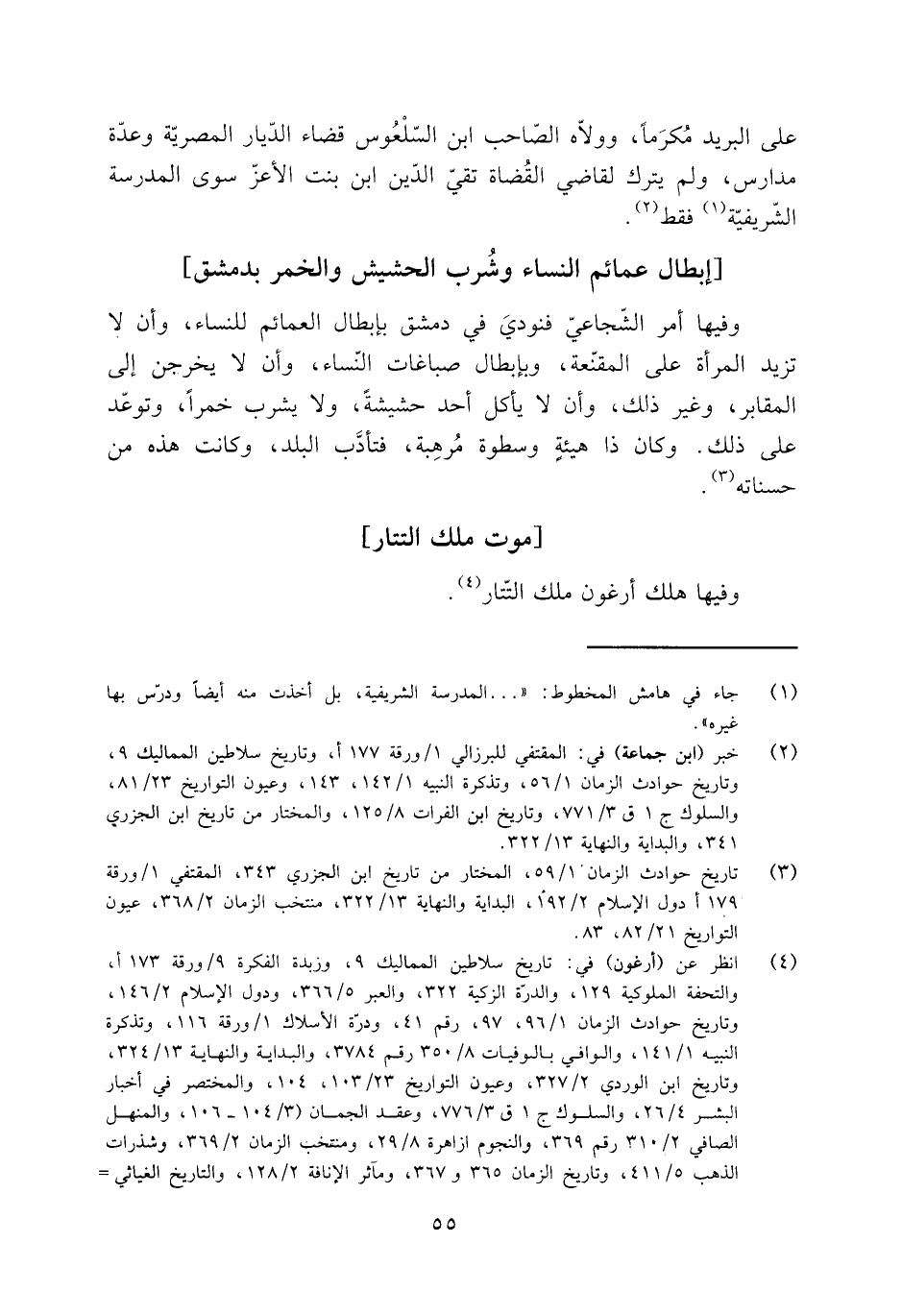 وفيها أمر الشّجاعيّ فنودي فِي دمشق بإبطال العمائم للنساء، وأن لا تزيد المرأة على المقنّعة، وبإبطال صباغات النّساء، وأن لا يخرجن إلى المقابر، وغير ذَلِكَ، وأن لا يأكل أحد حشيشة، ولا يشرب خمرا، وتوعّد عَلَى ذلك. وكان ذا هيئة وسطوة ومرهبة، فتأدَّب البلد، وكانت هذه من حسناته [3] .