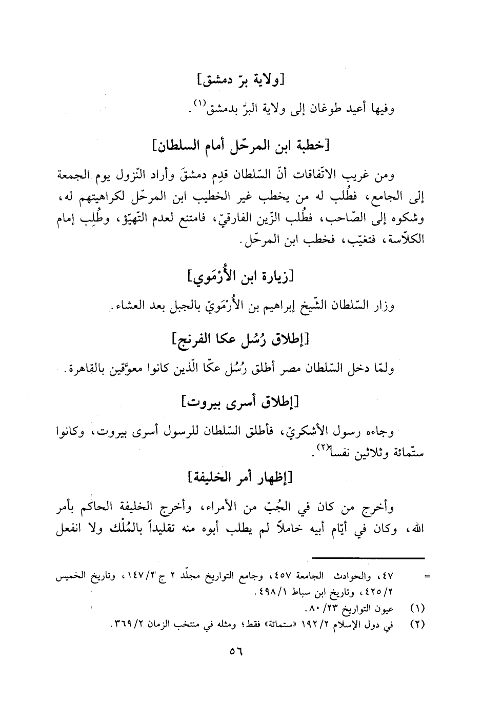[ () ] 47، والحوادث الجامعة 457، وجامع التواريخ مجلّد 2 ج 2/ 147، وتاريخ الخميس 2/ 425، وتاريخ ابن سباط 1/ 498.