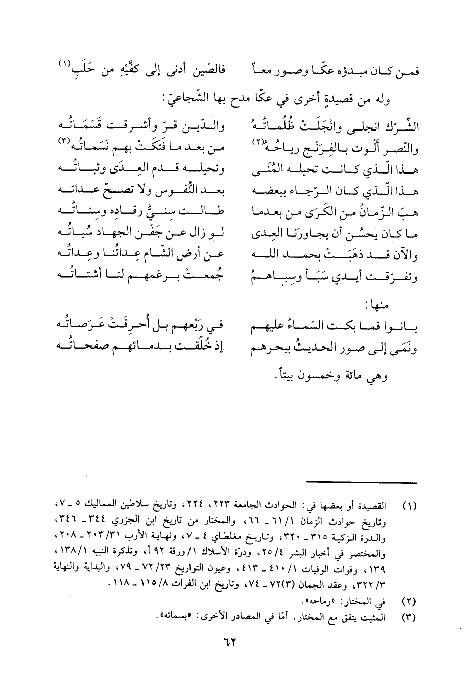 [1] القصيدة أو بعضها في: الحوادث الجامعة 223، 224، وتاريخ سلاطين المماليك 5- 7، وتاريخ حوادث الزمان 1/ 61- 66، والمختار من تاريخ ابن الجزري 344- 346، والدرة الزكية 315- 320، وتاريخ مغلطاي 4- 7، ونهاية والأرب 31/ 203- 208، والمختصر في أخبار البشر 4/ 25، ودرّة الأسلاك 1/ ورقة 92 أ، وتذكرة النبيه 1/ 138، 139، وفوات الوفيات 1/ 410- 413، وعيون التواريخ 23/ 72- 79، والبداية والنهاية 3/ 322، وعقد الجمان (3) 72- 74، وتاريخ ابن الفرات 8/ 115- 118.