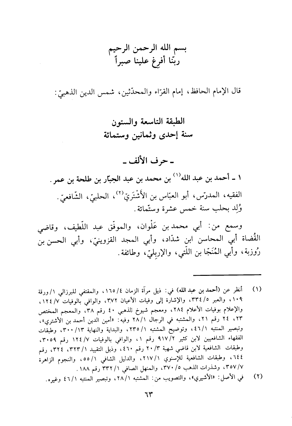 بسم اللَّه الرَّحْمَن الرحيم رَبَّنا أَفْرِغْ عَلَيْنا صبرا قَالَ الإِمَام الحافظ، إمام القرّاء والمحدّثين، شمس الدين الذهبي: