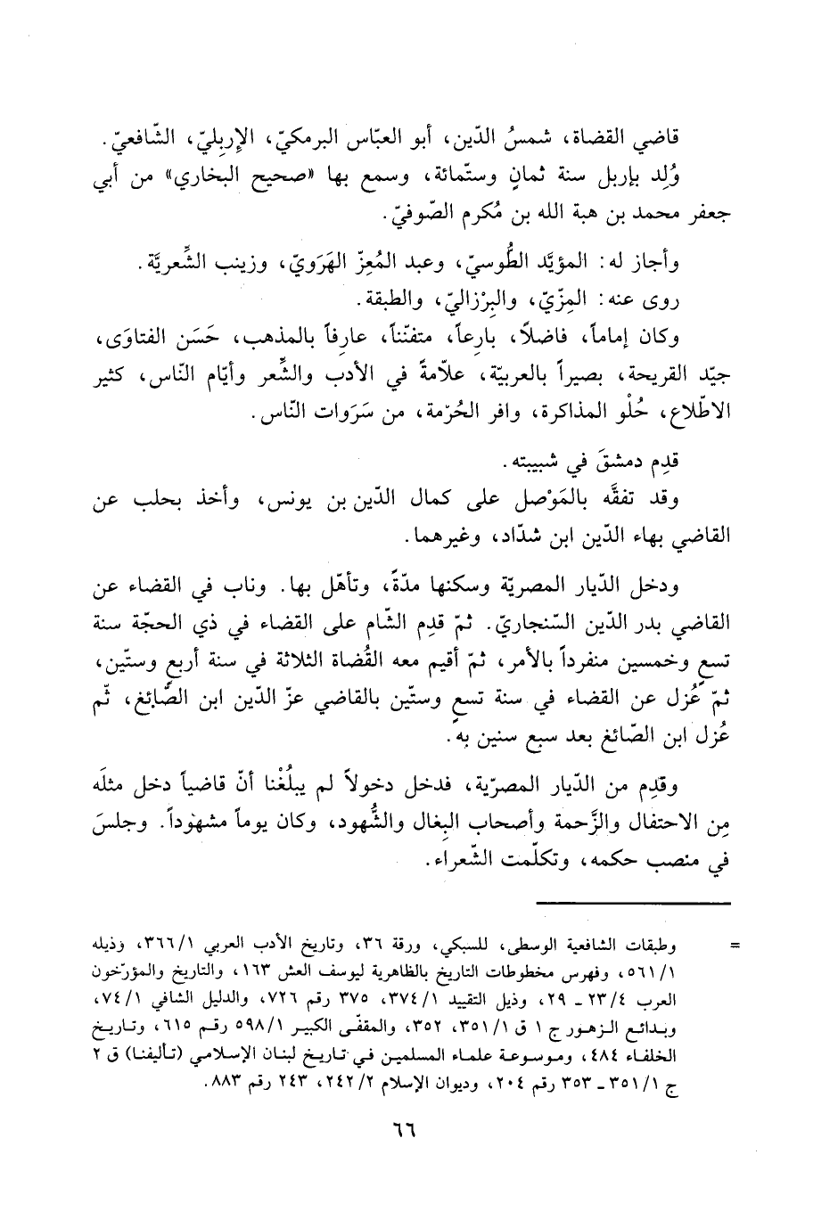 قاضي القضاة، شمسُ الدّين، أَبُو العبّاس البرمكيّ، الإربليّ، الشّافعيّ.