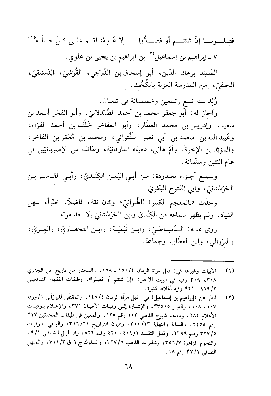 [2] انظر عن (إبراهيم بن إسماعيل) في: ذيل مرآة الزمان 4/ 148، والمقتفي للبرزالي 1/ ورقة 107، 108، والعبر 5/ 335، والإشارة إلى وفيات الأعيان 371، والإعلام بوفيات الأعلام 284، ومعجم شيوخ الذهبي 102 رقم 125، والمعين في طبقات المحدثين 217 رقم 2255، والبداية والنهاية 13/ 300، وعيون التواريخ 21/ 316، والوافي بالوفيات 5/ 327 رقم 2399، وذيل التقييد 1/ 419، 420 رقم 822، والدليل الشافي 1/ 9، والنجوم الزاهرة 7/ 356، وشذرات الذهب 5/ 327، والسلوك ج 1 ق 3/ 711، والمنهل الصافي 1/ 37 رقم 18.