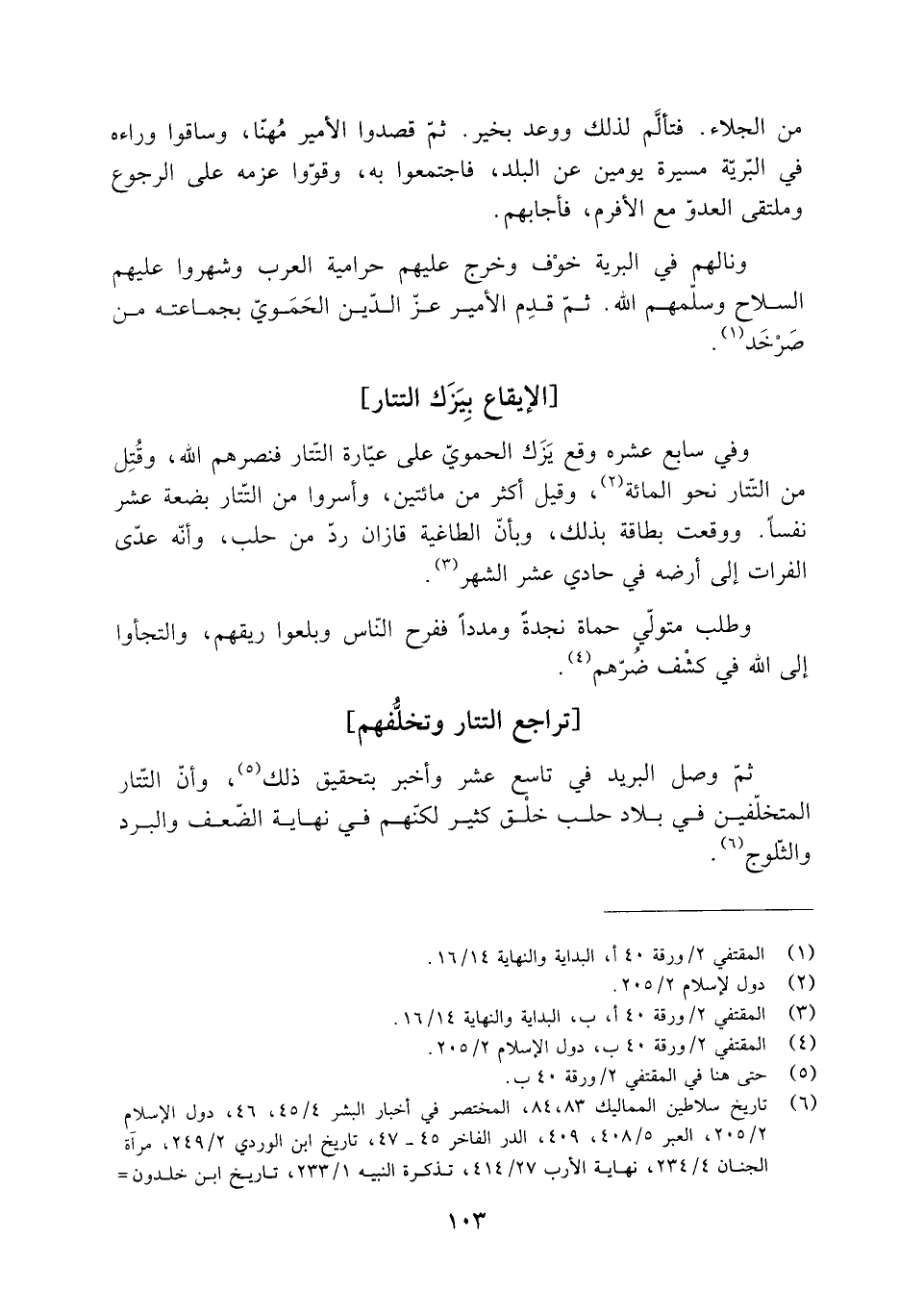 ثُمَّ وصل البريد في تاسع عَشْر وأخبر بتحقيق ذَلِكَ [5] ، وأن التَّتَار المتخلفين فِي بلاد حلب خَلْقٌ كثير لكنهم في نهاية الضّعف والبرد والثّلوج [6] .