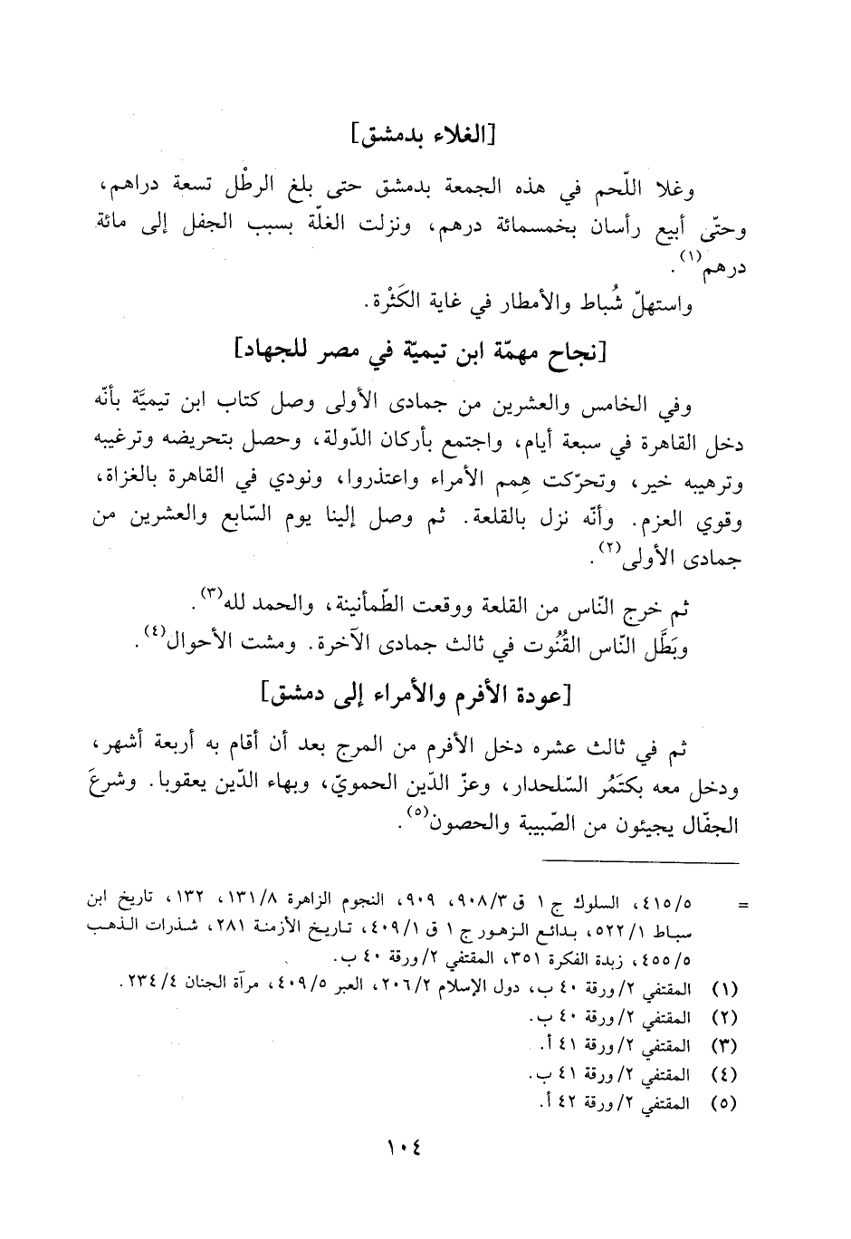 وفي الخامس والعشرين من جُمَادَى الأولى وصل كتاب ابن تيمية بأنّه دخل القاهرة فِي سبعة أيام، واجتمع بأركان الدّولة، وحصل بتحريضه وترغيبه وترهيبه خير، وتحرّكت هِمم الأمراء واعتذروا، ونودي فِي القاهرة بالغزاة، وقوي العزم. وأنّه نزل بالقلعة. ثُمَّ وصل إلينا يوم السّابع والعشرين من جُمَادَى الأولى [2] .