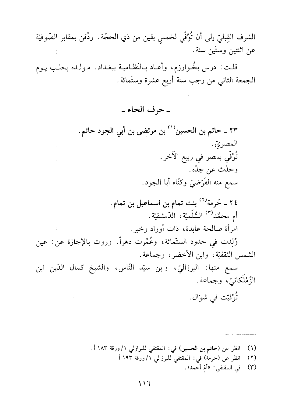 [1] انظر عن (حاتم بن الحسين) في: المقتفي للبرازلي 1/ ورقة 183 أ.
