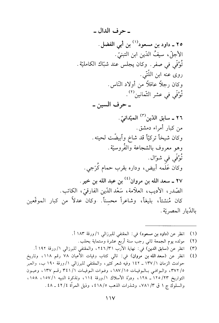 [4] انظر عن (سعد الله بن مروان) في: تالي كتاب وفيات الأعيان 78 رقم 118، وتاريخ حوادث الزمان 1/ 137- 142 وفيه شعر كثير، والمقتفي للبرزالي 1/ ورقة 190 ب، والعبر 5/ 372، والوافي بالوفيات 15/ 187، وفوات الوفيات 1/ 341 رقم 137، وعيون التواريخ 23/ 125- 128، ودرّة الأسلاك 1/ ورقة 114، وتذكرة النبيه 1/ 157، 158، والسلوك ج 1 ق 3/ 781، وشذرات الذهب 5/ 418، وذيل المرآة 4/ 42- 48.