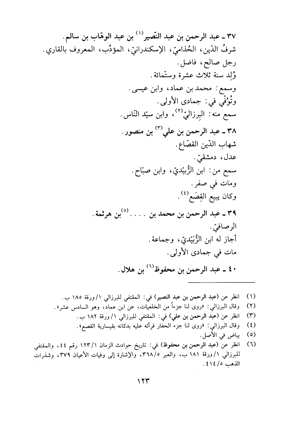 [1] انظر عن (عبد الرحمن بن عبد النصير) في: المقتفي للبرزالي 1/ ورقة 185 ب.