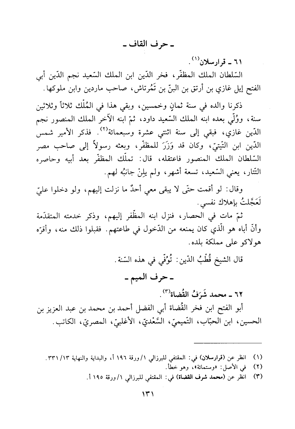 [1] انظر عن (قرا رسلان) في: المقتفي للبرزالي 1/ ورقة 196 أ، والبداية والنهاية 13/ 331.