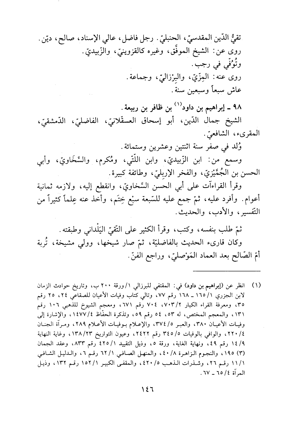 [1] انظر عن (إبراهيم بن داود) في: المقتفي للبرزالي 1/ ورقة 200 ب، وتاريخ حوادث الزمان لابن الجزري 1/ 165- 168 رقم 77، وتالي كتاب وفيات الأعيان للصقاعي 24، 25 رقم 35، ومعرفة القراء الكبار 2/ 703، 704 رقم 671، ومعجم الشيوخ للذهبي 106 رقم 131، والمعجم المختص، له 53، 54 رقم 59، وتذكرة الحفاظ 4/ 1477، والإشارة إلى وفيات الأعيان 380، والعبر 5/ 374، والإعلام بوفيات الأعلام 289، ومرآة الجنان 4/ 220، والوافي بالوفيات 5/ 345 رقم 2422، وعيون التواريخ 23/ 138، وغاية النهاية 9/ 14 رقم 49، ونهاية الغاية ورقة 5، وذيل التقييد 1/ 425 رقم 833، وعقد الجمان (3) 195، والنجوم الزاهرة 8/ 40، والمنهل الصافي 1/ 62 رقم 6، والدليل الشافي 1/ 11 رقم 26، وشذرات الذهب 5/ 420، والمقفى الكبير 1/ 152 رقم 132، وذيل المرآة 4/ 65- 67.