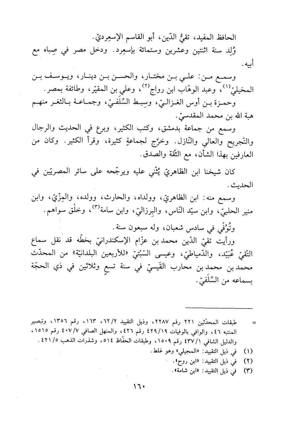 الحافظ المفيد، تقيُّ الدِّين، أبو القَاسِم الإسعِرديّ.
