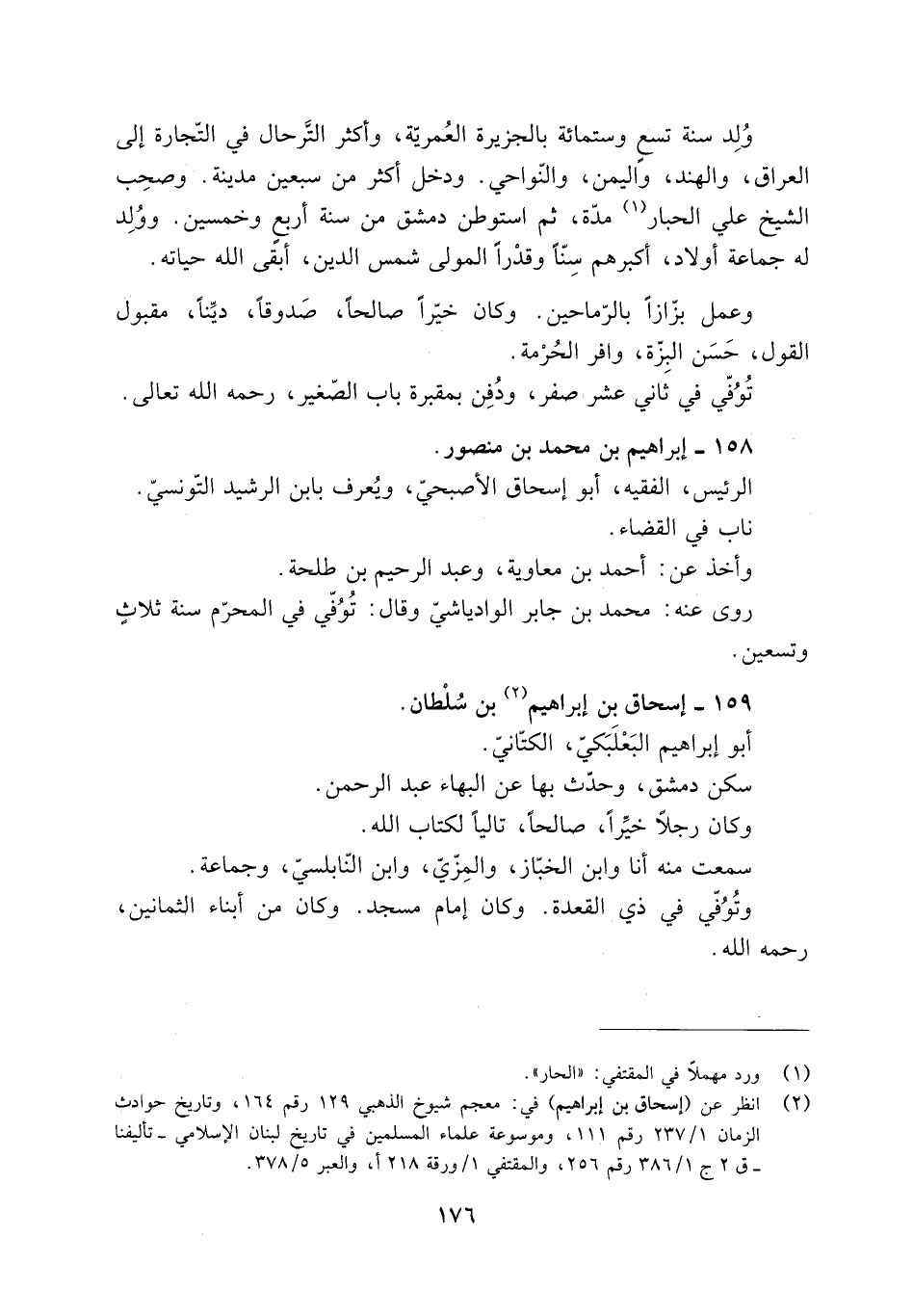 [2] انظر عن (إسحاق بن إبراهيم) في: معجم شيوخ الذهبي 129 رقم 164، وتاريخ حوادث الزمان 1/ 237 رقم 111، وموسوعة علماء المسلمين في تاريخ لبنان الإسلامي- تأليفنا- ق 2 ج 1/ 386 رقم 256، والمقتفي 1/ ورقة 218 أ، والعبر 5/ 378.