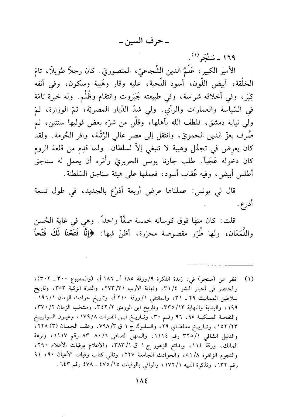 [1] انظر عن (سنجر) في: زبدة الفكرة 9/ ورقة 185 أ- 186 أ، (والمطبوع 300- 302) ، والمختصر في أخبار البشر 4/ 31، ونهاية الأرب 31/ 273، والدرة الزكية 353، وتاريخ سلاطين المماليك 29- 31، والمقتفي 1/ ورقة 210 أ، وتاريخ حوادث الزمان 1/ 196- 199، والبدآية والنهاية 13/ 335، وتاريخ ابن الوردي 2/ 342، ومنتخب الزمان 2/ 370، والنفحة المسكية 95، 96 رقم 30، وتاريخ ابن الفرات 8/ 179، وعيون التواريخ 23/ 152، وتاريخ مغلطاي 29، والسلوك ج 1 ق 3/ 798، وعقد الجمان (3) 228، والدليل الشافي 1/ 325 رقم 1114، والمنهل الصافي 6/ 80 83 رقم 1117، ونزهة المالك، ورقة 114، وبدائع الزهور ج 1 ق 1/ 383، والإعلام بوفيات الأعلام 290، والنجوم الزاهرة 8/ 51، والحوادث الجامعة 227، وتالي كتاب وفيات الأعيان 90، 91 رقم 132، وتذكرة النبيه 1/ 172، والوافي بالوفيات 15/ 475- 478 رقم 643.