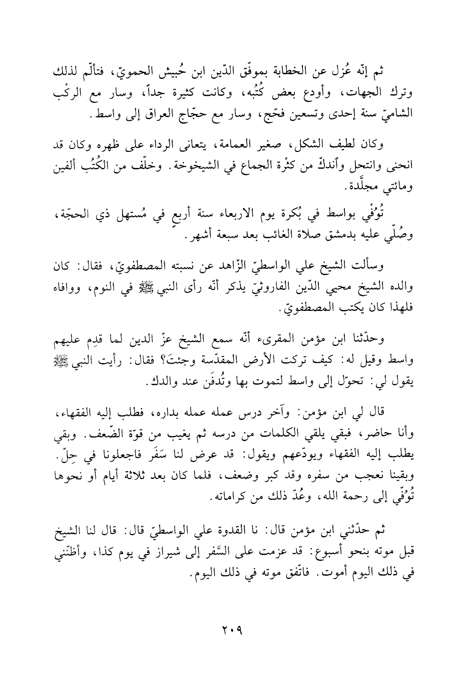 ثُمَّ حَدَّثَنِي ابن مؤمن قال: نا القدوة علي الواسطيّ قال: قال لنا الشَّيْخ قبل موته بنحو أسبوع: قد عزمت على السَّفر إلى شيراز فِي يوم كذا. وأظنني فِي ذَلِكَ اليوم أموت. فاتّفق موته فِي ذَلِكَ اليوم.