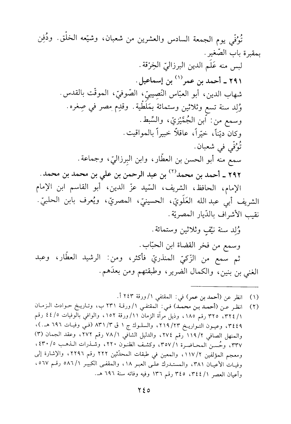 [2] انظر عن (أحمد بن محمد) في: المقتفي 1/ ورقة 231 ب، وتاريخ حوادث الزمان 1/ 324، 325 رقم 185، وذيل مرآة الزمان 11/ ورقة 152، والوافي بالوفيات 5/ 44 رقم 3449، وعيون التواريخ 23/ 219، والسلوك ج 1 ق 3/ 831 (في وفيات 696 هـ.) ، والمنهل الصافي 2/ 119 رقم 274، والدليل الشافي 1/ 78 رقم 272، وعقد الجمان (3) 337، وحسن المحاضرة 1/ 357، وكشف الظنون 220، وشذرات الذهب 5/ 430، ومعجم المؤلفين 2/ 117، والمعين في طبقات المحدّثين 222 رقم 2296، والإشارة إلى وفيات الأعيان 381، والمستدرك على العبر 18، والمقتفي الكبير 1/ 586 رقم 567، وأعيان العصر 1/ 344، 345 رقم 136 وفيه وفاته سنة 696 هـ.