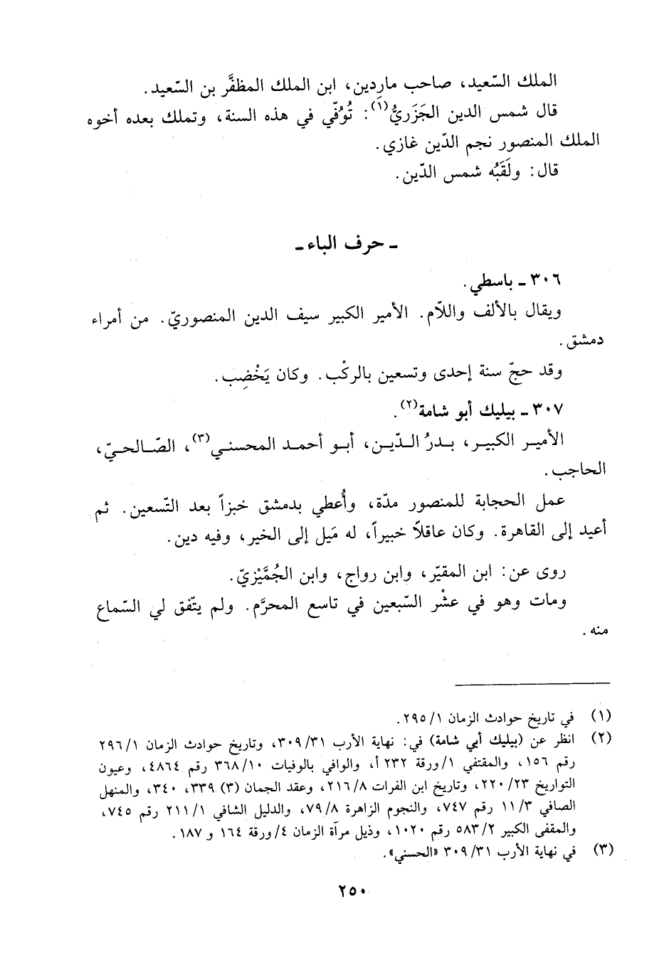 [2] انظر عن (بيليك أبي شامة) في: نهاية الأرب 31/ 309، وتاريخ حوادث الزمان 1/ 296 رقم 156، والمقتفي 1/ ورقة 232 أ، والوافي بالوفيات 10/ 368 رقم 4864، وعيون التواريخ 23/ 220، وتاريخ ابن الفرات 8/ 216، وعقد الجمان (3) 339، 340، والمنهل الصافي 3/ 11 رقم 747، والنجوم الزاهرة 8/ 79، والدليل الشافي 1/ 211 رقم 745، والمقفى الكبير 2/ 583 رقم 1020، وذيل مرآة الزمان 4/ ورقة 164 و 187.