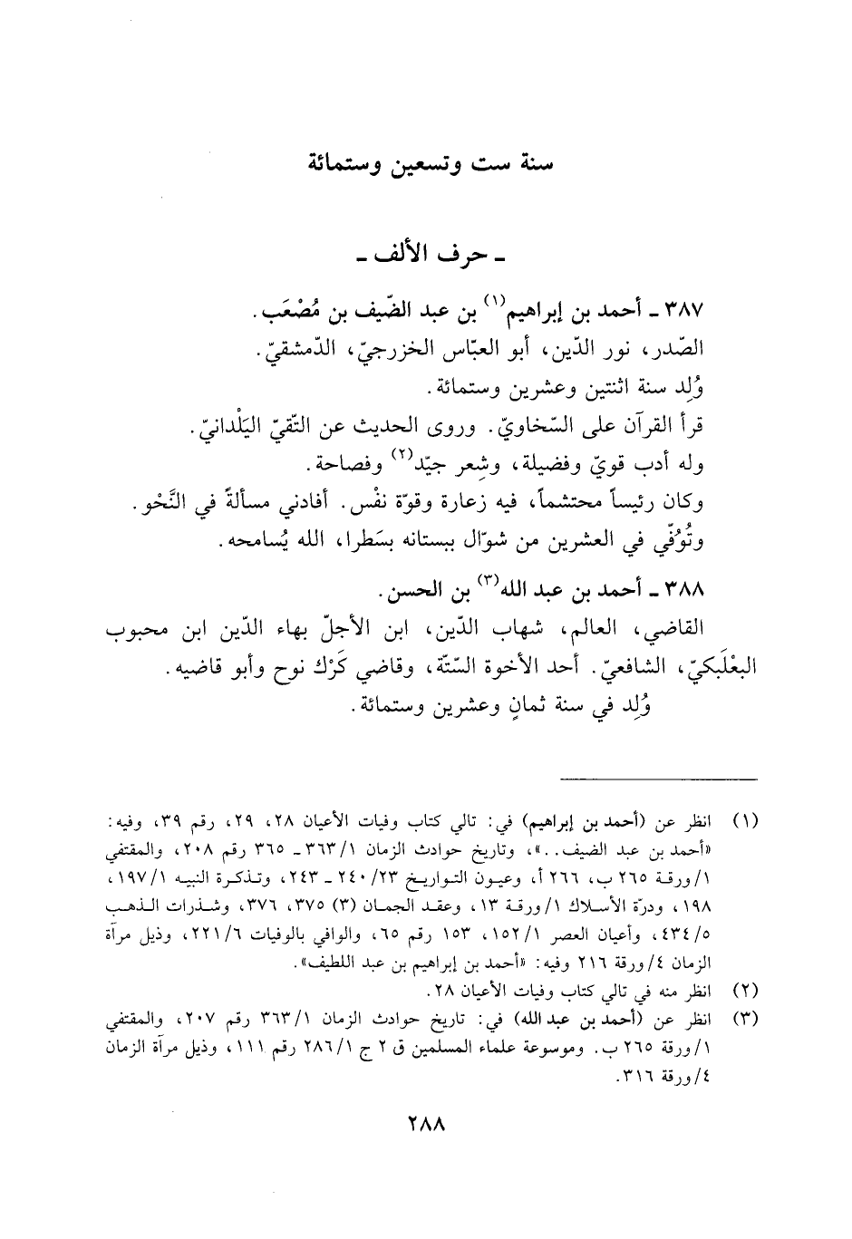 [3] انظر عن (أحمد بن عبد الله) في: تاريخ حوادث الزمان 1/ 363 رقم 207، والمقتفي 1/ ورقة 265 ب. وموسوعة علماء المسلمين ق 2 ج 1/ 286 رقم 111، وذيل مرآة الزمان 4/ ورقة 316.