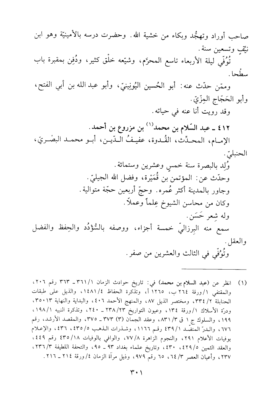 [1] انظر عن (عبد السلام بن محمد) في: تاريخ حوادث الزمان 1/ 361- 363 رقم 206، والمقتفي 1/ ورقة 264 ب، 1265 أ، وتذكرة الحفاظ 4/ 1481، والذيل على طبقات الحنابلة 2/ 334، ومختصر الذيل 87، والمنهج الأحمد 406، والبداية والنهاية 35013، ودرةّ الأسلاك 1/ ورقة 134، وعيون التواريخ 23/ 238- 240، وتذكرة النبيه 1/ 198.