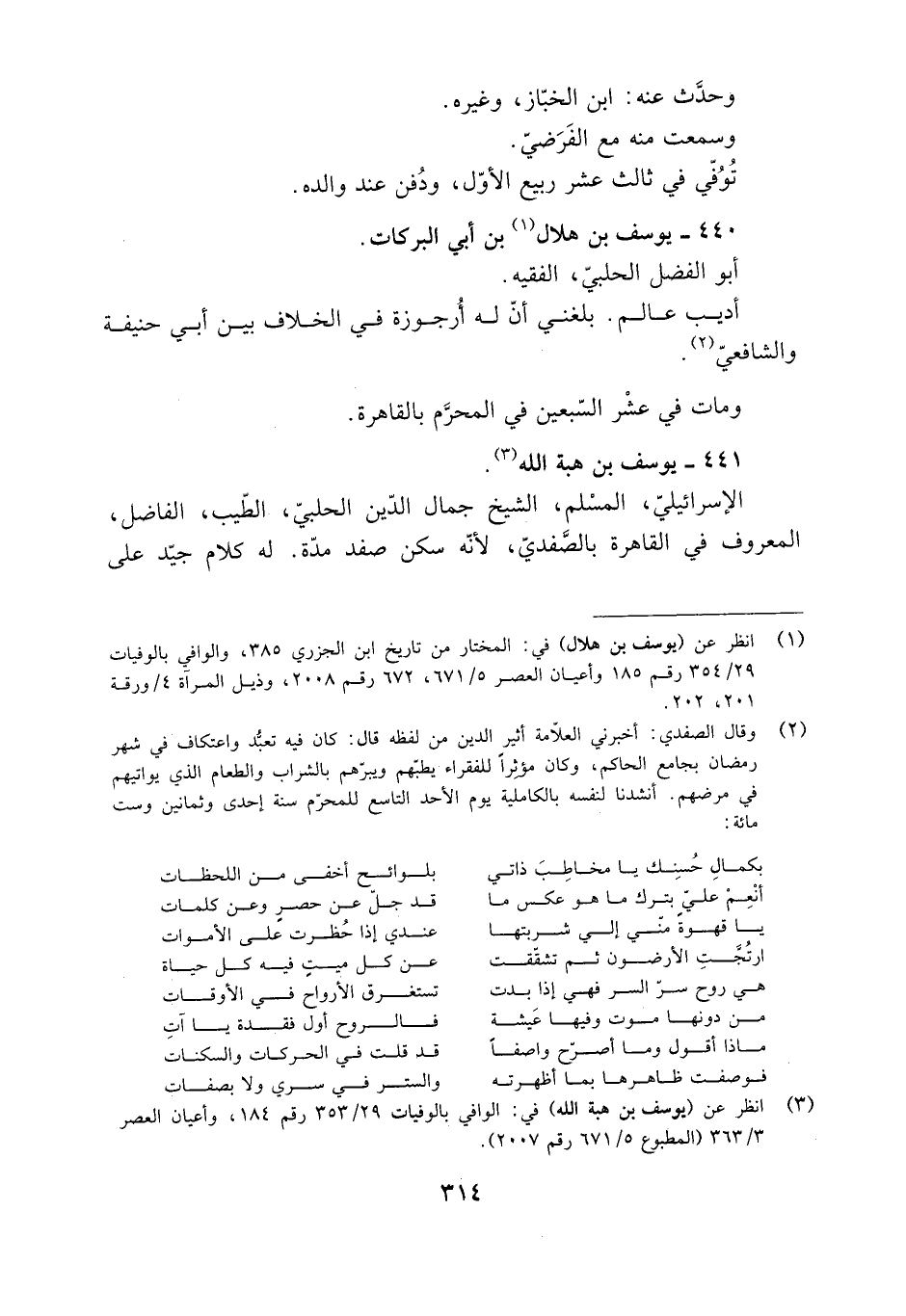 [3] انظر عن (يوسف بن هبة الله) في: الوافي بالوفيات 29/ 353 رقم 184، وأعيان العصر 3/ 363 (المطبوع 5/ 671 رقم 2007) .