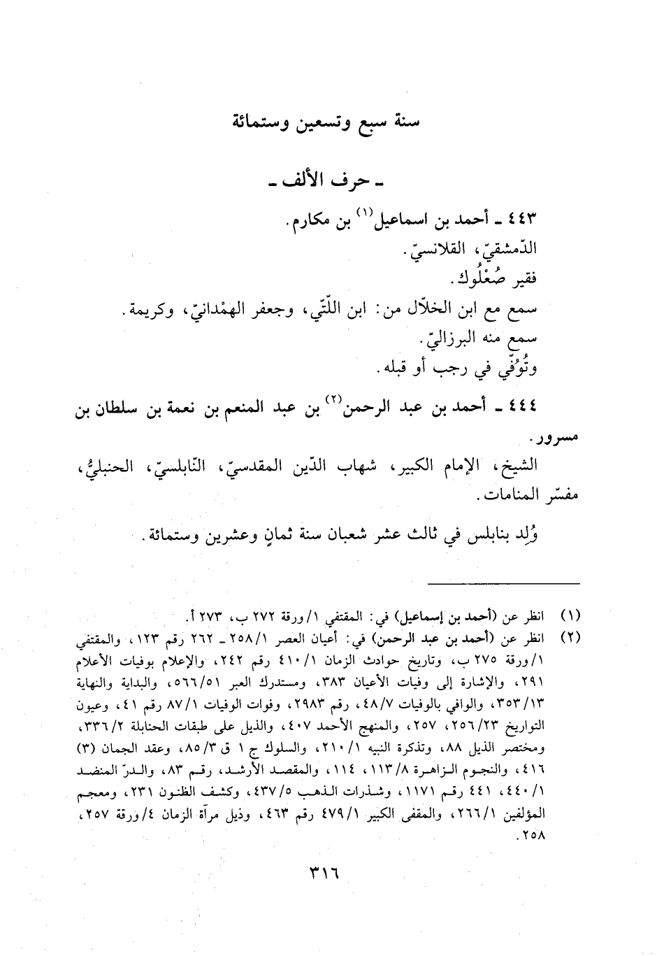 [2] انظر عن (أحمد بن عبد الرحمن) في: أعيان العصر 1/ 258- 262 رقم 123، والمقتفي 1/ ورقة 275 ب، وتاريخ حوادث الزمان 1/ 410 رقم 242، والإعلام بوفيات الأعلام 291، والإشارة إلى وفيات الأعيان 383، ومستدرك العبر 51/ 566: والبداية والنهاية 13/ 353، والوافي بالوفيات 7/ 48، رقم 2983، وفوات الوفيات 1/ 87 رقم 41، وعيون التواريخ 23/ 256، 257، والمنهج الأحمد 407، والذيل على طبقات الحنابلة 2/ 336، ومختصر الذيل 88، وتذكرة النبيه 1/ 210، والسلوك ج 1 ق 3/ 85، وعقد الجمان (3) 416، والنجوم الزاهرة 8/ 113، 114، والمقصد الأرشد. رقم 83، والدر المنضد 1/ 440، 441 رقم 1171، وشذرات الذهب 5/ 437، وكشف الظنون 231، ومعجم المؤلفين 1/ 266، والمقفى الكبير 1/ 479 رقم 463، وذيل مرآة الزمان 4/ ورقة 257، 258.