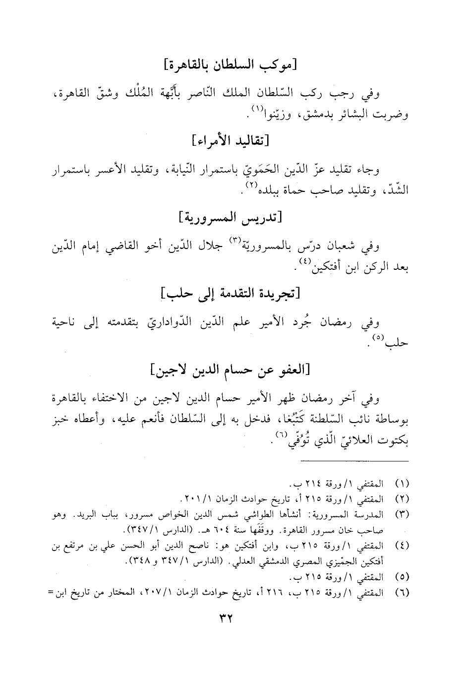 [6] المقتفي 1/ ورقة 215 ب، 216 أ، تاريخ حوادث الزمان 1/ 207، المختار من تاريخ ابن