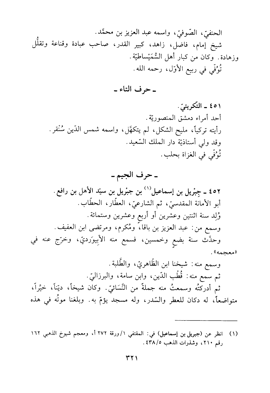 [1] انظر عن (جبريل بن إسماعيل) في: المقتفي 1/ ورقة 272 أ، ومعجم شيوخ الذهبي 162 رقم 210، وشذرات الذهب 5/ 438.