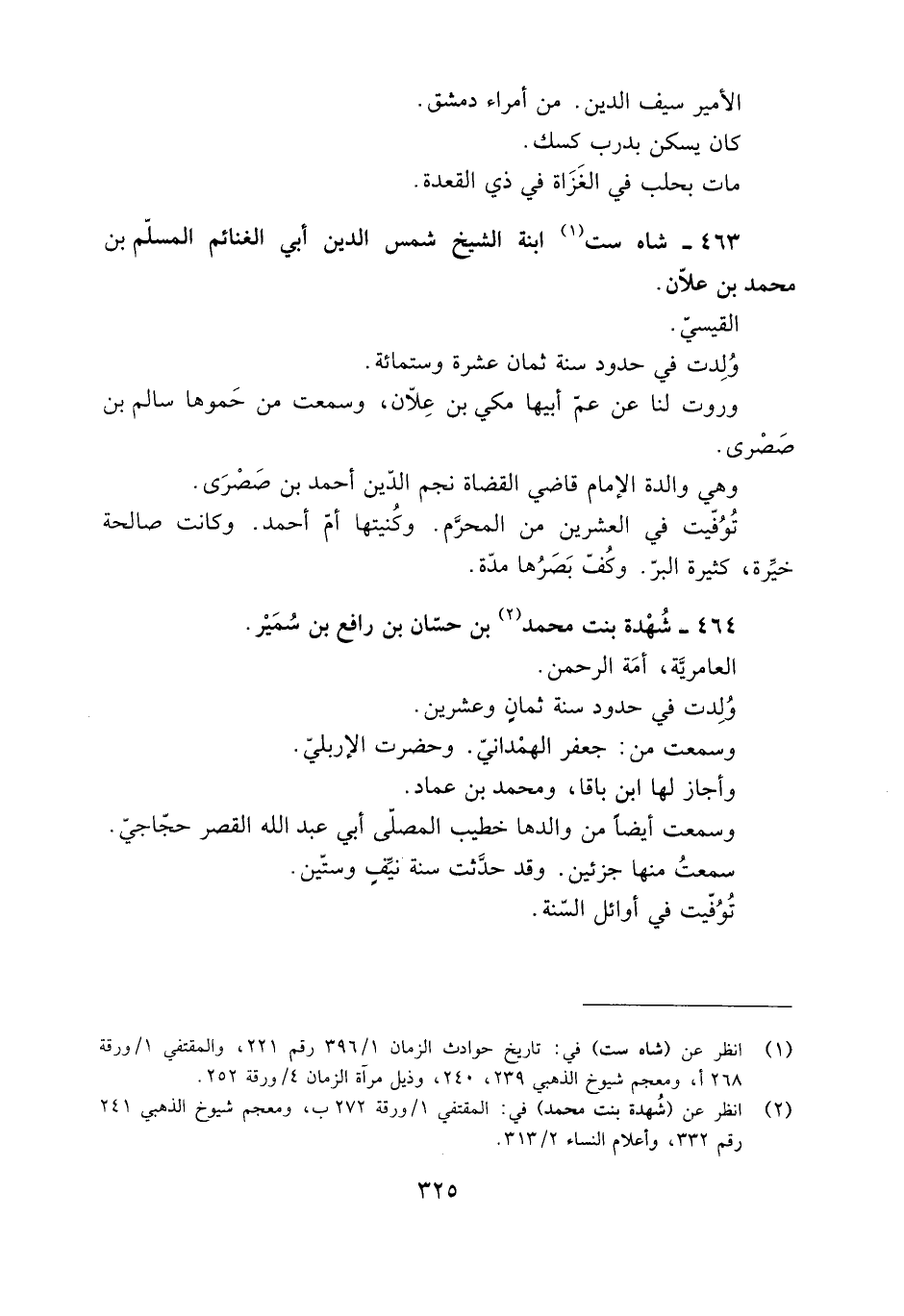 [2] انظر عن (شهدة بنت محمد) في: المقتفي 1/ ورقة 272 ب، ومعجم شيوخ الذهبي 241 رقم 332، وأعلام النساء 2/ 313.