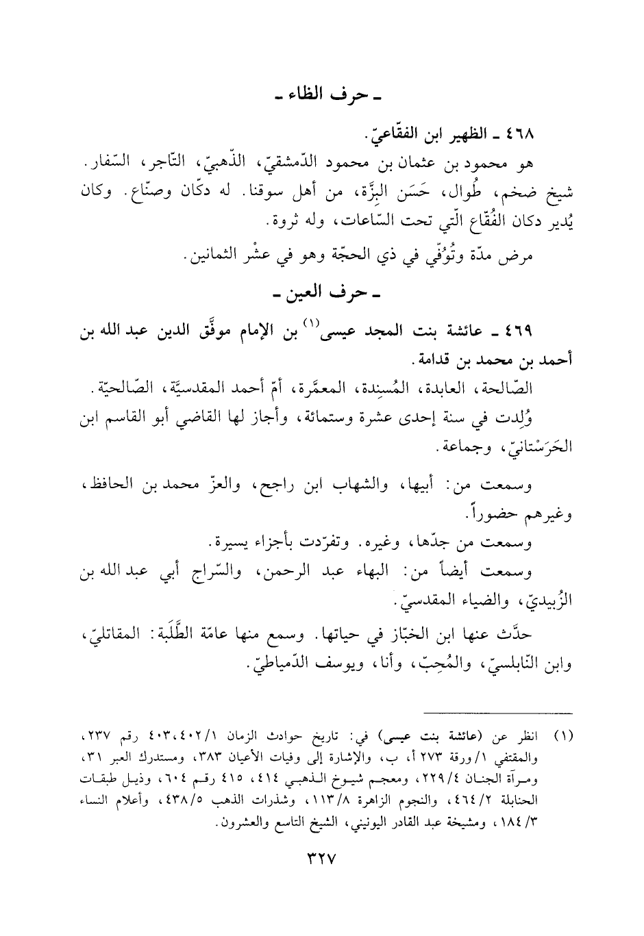 469- عَائِشَة بِنْت المجد عيسى [1] بن الإمام مُوَفَّق الدِّين عَبْد اللَّه بْن أَحْمَد بْن مُحَمَّد بْن قدامة.
