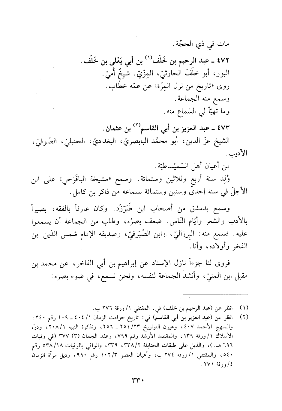 [2] انظر عن (عبد العزيز بن أبي القاسم) في: تاريخ حوادث الزمان 1/ 404- 409 رقم 240، والمنهج الأحمد 407، وعيون التواريخ 23/ 251- 256، وتذكرة النبيه 1/ 208، ودرّة الأسلاك 1/ ورقة 139، والمقصد الأرشد رقم 799، وعقد الجمان (3) 377 (في وفيات 696 هـ.) والذيل على طبقات الحنابلة 2/ 338، 339، والوافي بالوفيات 18/ 538 رقم 540، والمقتفي 1/ ورقة 274 ب، وأعيان العصر 3/ 102 رقم 990، وذيل مرآة الزمان 4/ ورقة 271.