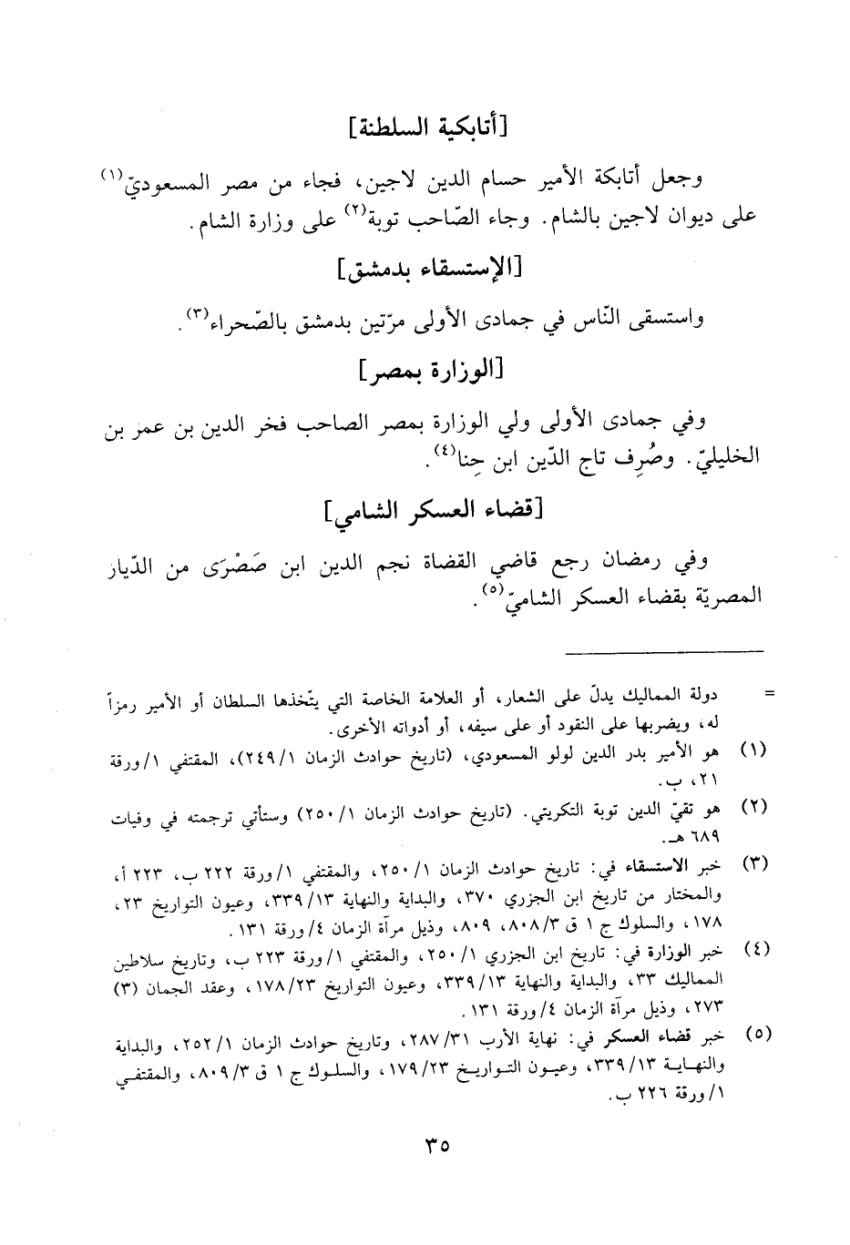 [5] خبر قضاء العسكر في: نهاية الأرب 31/ 287، وتاريخ حوادث الزمان 1/ 252، والبداية والنهاية 13/ 339، وعيون التواريخ 23/ 179، والسلوك ج 1 ق 3/ 809، والمقتفي 1/ ورقة 226 ب.