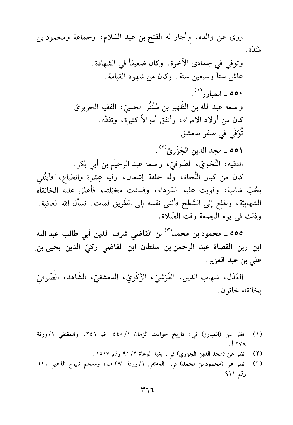 [3] انظر عن (محمود بن محمد) في: المقتفي 1/ ورقة 283 ب، ومعجم شيوخ الذهبي 611 رقم 911.