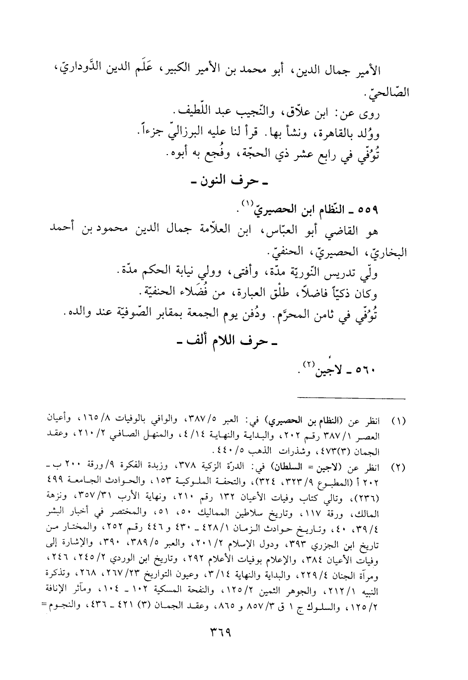 [1] انظر عن (النظام بن الحصيري) في: العبر 5/ 387، والوافي بالوفيات 8/ 165، وأعيان العصر 1/ 387 رقم 202، والبداية والنهاية 14/ 4، والمنهل الصافي 2/ 210، وعقد الجمان (3) 473، وشذرات الذهب 5/ 440.