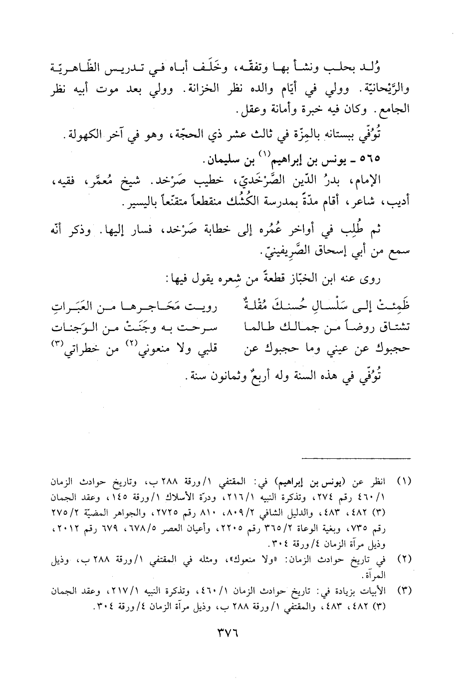 [1] انظر عن (يونس بن إبراهيم) في: المقتفي 1/ ورقة 288 ب، وتاريخ حوادث الزمان 1/ 460 رقم 274، وتذكرة النبيه 1/ 216، ودرة الأسلاك 1/ ورقة 145، وعقد الجمان (3) 482، 483، والدليل الشافي 2/ 809، 810 رقم 2725، والجواهر المضية 2/ 275 رقم 735، وبغية الوعاة 2/ 365 رقم 2205، وأعيان العصر 5/ 678، 679 رقم 2012، وذيل مرآة الزمان 4/ ورقة 304.
