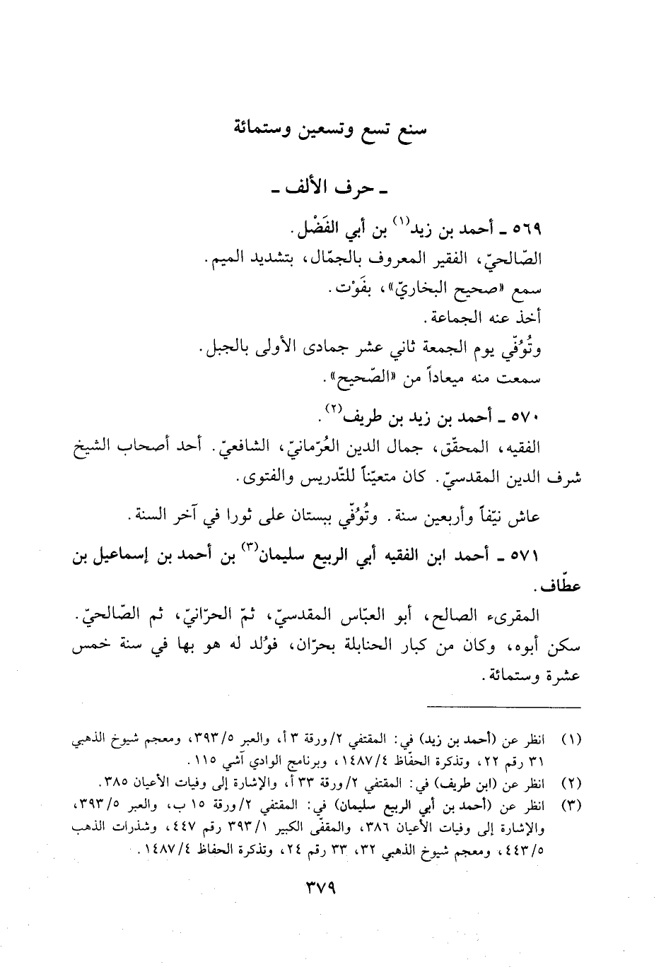 [1] انظر عن (أحمد بن زيد) في: المقتفي 2/ ورقة 3 أ، والعبر 5/ 393، ومعجم شيوخ الذهبي 31 رقم 22، وتذكرة الحفّاظ 4/ 1487، وبرنامج الوادي آشي 115.